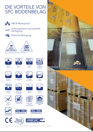 Der harte SPC-Kern (SPC Core oder “Rigid Board”) ist mit einer HD DruckDecorfolie und einem schützenden, antibakteriellen UV-Film versehen. Diese UVBeschichtung enthält keramische Komponenten und garantiert Resistenz gegen Abnutzung und Kratzer. Außerdem schützt diese spezielle Beschichtung vor Sonnenstrahlen und Licht – kein Ausbleichen in der Nähe von Fenstern.