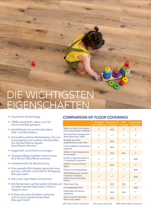 SPC (STONE POLYMER COMPOSITE) CORE: formstabile Trägerplatte, ein sog. “Rigid Board” oder “Rigid Core” aus qualitativ hochwertigem Material für eine extreme Stabilität.
